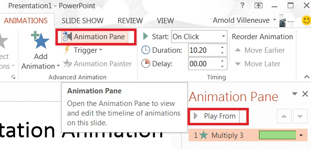 Now that you have added animation to the SmartArt graphic in your slide you can play the animation to see what it looks like. Just click on the Animation Pane button in the Animation Ribbon. The Animation Pane window will open. From there click on the Play From button.