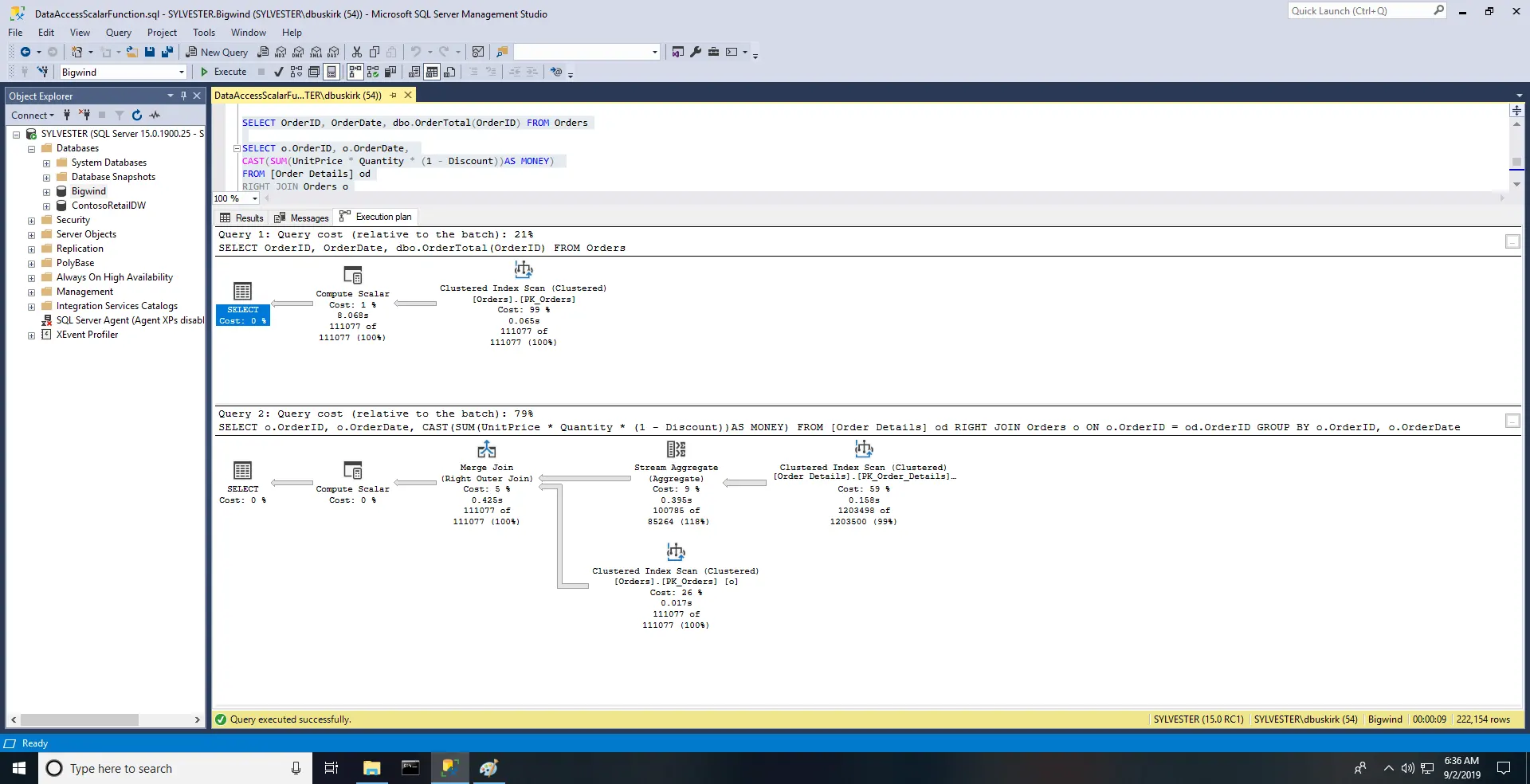 In SQL Server 2019, Froid technology is applied to this problem with great benefit. Let's explore a query using the Learning Tree "Bigwind" database, which has the same table structure as Microsoft's class Northwind, but which was designed to illustrate poor performance. We'll start by creating a scalar UDF that accesses a database.